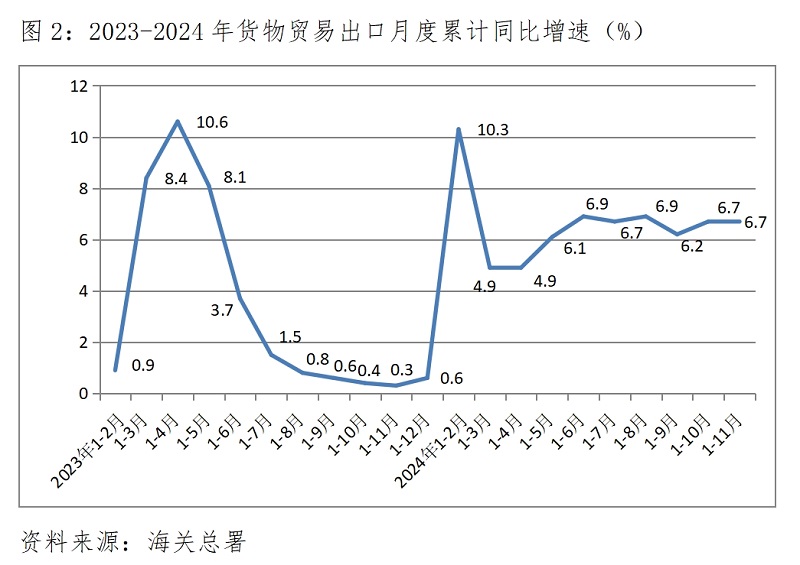 (二)貨物出口增速由升轉(zhuǎn)平。1-11月份,貨物出口同比增長6.7%,與1-10月份增速持平,1-10月份增速比1-9月份增速6.2%回升0.5個百分點(diǎn)。對歐盟、美國和東盟等貨物出口增速全面回升,1-11月份對歐盟出口增長3.8%,比1-10月份回升0.3個百分點(diǎn);對美國出口增長5.1%,比1-10月份回升0.2個百分點(diǎn);對東盟出口增長12.7%,比1-10月份回升0.2個百分點(diǎn);但對拉丁美洲出口增長14.1%,比1-10月份回落0.4個百分點(diǎn)。
