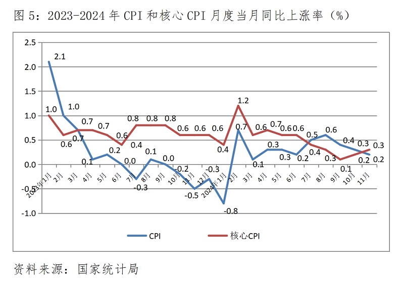 (三) CPI漲幅繼續(xù)小幅回落。11月份,CPI同比上漲0.2%,比10月份上漲0.3%回落了0.1個百分點(diǎn),而10月份漲幅比9月份漲幅回落0.1個百分點(diǎn),延續(xù)了上月漲幅回落的態(tài)勢。其中食品價格上漲1.0%,比上月上漲2.9%回落1.9個百分點(diǎn);非食品價格持平,上月為下降0.3%。11月份,核心CPI同比上漲0.3%,比10月份上漲0.2%回升了0.1個百分點(diǎn)。CPI和核心CPI漲幅都仍還比較低,說明市場需求仍還較為疲弱。