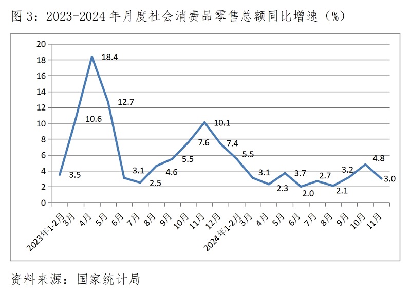 (一)零售增速由升轉(zhuǎn)落。11月份,社會消費(fèi)品零售總額同比增長3.0%,比10月份增長4.8%回落1.8個百分點(diǎn),而10月份增速比9月份增速3.2%回升了1.6個百分點(diǎn)。但受消費(fèi)品以舊換新政策措施的持續(xù)作用,家用電器和音像器材和汽車銷售仍保持較快增長,11月份限額以上企業(yè)家用電器和音像器材零售額繼續(xù)保持調(diào)整增長22.2%,已連續(xù)3個月保持兩位數(shù)增長;汽車零售額增長6.6%,比上月回升2.9個百分點(diǎn),10月份比9月份回升3.3個百分點(diǎn),已連續(xù)兩個月以大約3.0個百分點(diǎn)回升。