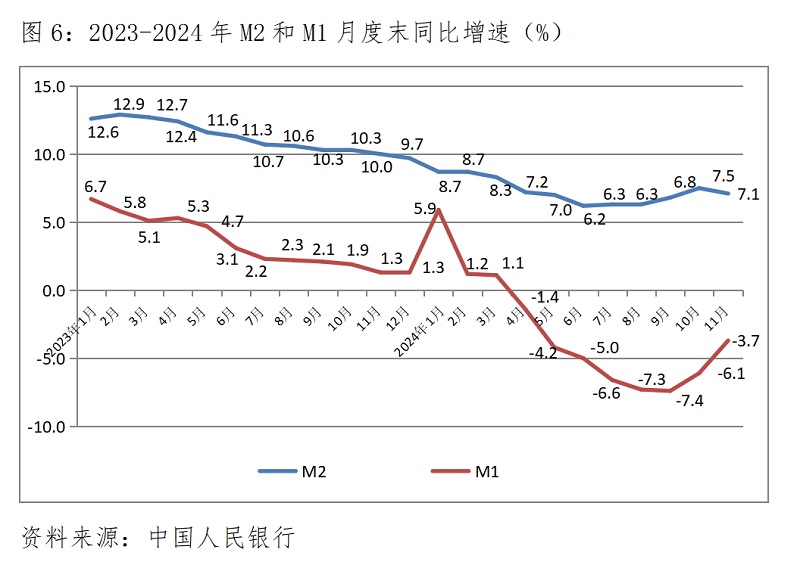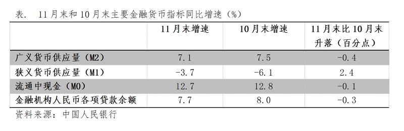 (四)M2增速由升轉(zhuǎn)落。11月末,廣義貨幣供應(yīng)量(M2)同比增長7.1%,比10月末增長7.5%回落0.4個百分點(diǎn),10月末增速比9月末增速回升0.7個百分點(diǎn);狹義貨幣供應(yīng)量(M1)降幅繼續(xù)縮小,11月末同比下降3.7%,比10月末同比下降6.1%縮小2.4個百分點(diǎn),10月末降幅比9月末降幅縮小1.3個百分點(diǎn);流通中貨幣(M0)增速由升轉(zhuǎn)落,11月末同比增長12.7%,比10月末增長12.8%回落0.1介百分點(diǎn),10月末增速比9月末增速回升了1.3個百分點(diǎn)。各層次貨幣供應(yīng)量又出現(xiàn)了不同方向的變化走勢。