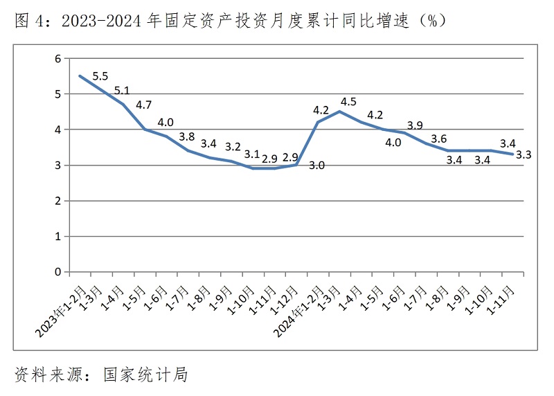 (二)投資增速由持平轉(zhuǎn)小幅回落。1-11月份,固定資產(chǎn)投資同比增長3.3%,與1-10月份增長3.4%回落0.1個百分點(diǎn),1-10月份增速與1-9月份持平,投資增速在保持連續(xù)3個月持平后出現(xiàn)了小幅回落。國有控股投資增速略有回落,1-11月份比1-10月份回落0.1個百分點(diǎn);民間投資降幅略有擴(kuò)大,1-11月份比1-10月份擴(kuò)大0.1個百分點(diǎn)。三次產(chǎn)業(yè)投資中,第一產(chǎn)業(yè)投資增速回落0.1個百分點(diǎn),第二產(chǎn)業(yè)投資增速回落0.2個百分點(diǎn),第三產(chǎn)業(yè)投資降幅擴(kuò)大0.1個百分點(diǎn)。