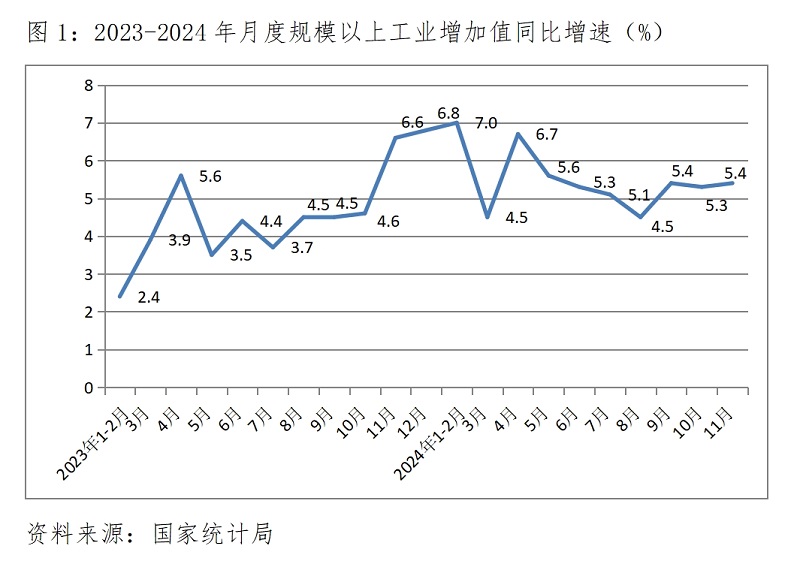 (一)工業(yè)增速由落轉(zhuǎn)升。11月份,規(guī)模以上工業(yè)增加值同比增長5.4%,比10月份增長5.3%回升了0.1個百分點(diǎn),10月份增速比9月份增速5.4%回落了0.1個百分點(diǎn)。其中,制造業(yè)同比增長6.0%,比上月回升0.6個百分點(diǎn);國有控股企業(yè)增長3.9%,回升0.1個百分點(diǎn);私營企業(yè)增長4.5%,回落0.3個百分點(diǎn)。
